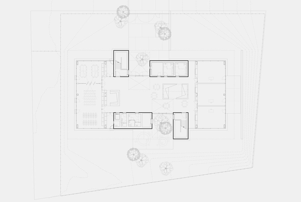 Conçu autour du concept de « place couverte », le bâtiment se compose d'un volume suspendu à quatre noyaux, créant un espace abrité qui relie harmonieusement intérieur et extérieur.