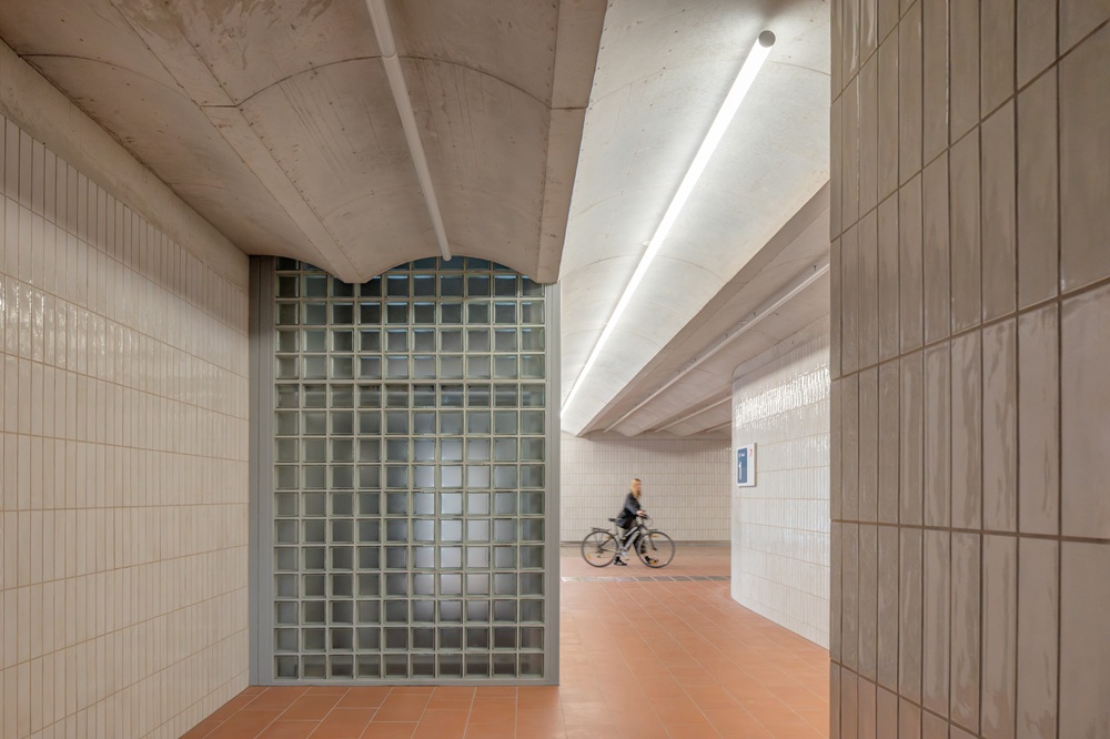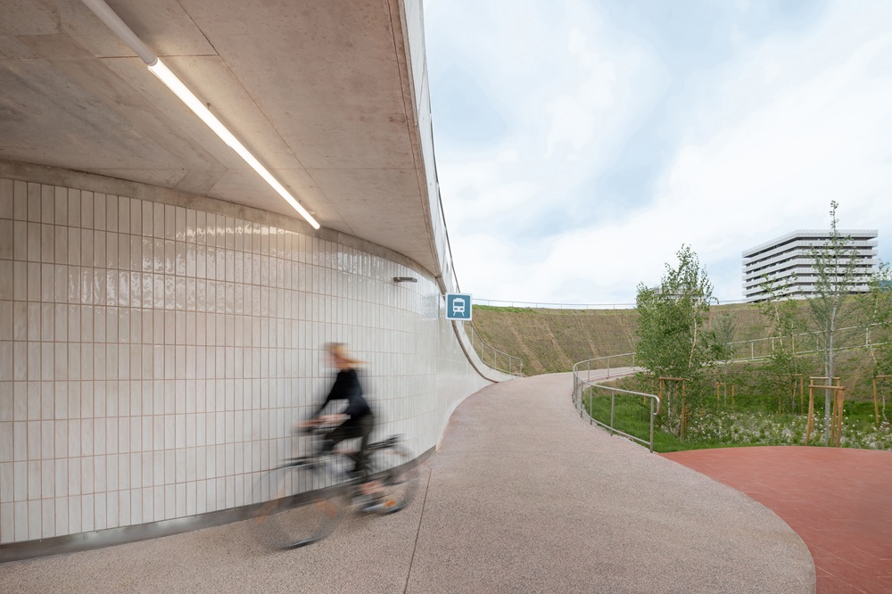 The underpass, which extends 36.6 metres in length and 8 metres in width (partly for bikes and partly for pedestrians), opens up at both ends onto lowered elliptical plazas that absorb daily flows while also encouraging informal usage: sitting, congregating, taking a break.