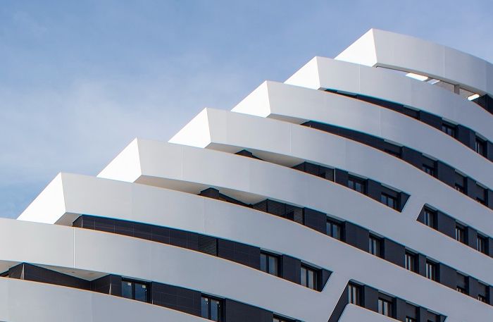The building’s strategic position opposite Felipe VI Park and Lake Valdebebas are the inspiration behind the curving structural design complete with bright white facades.
