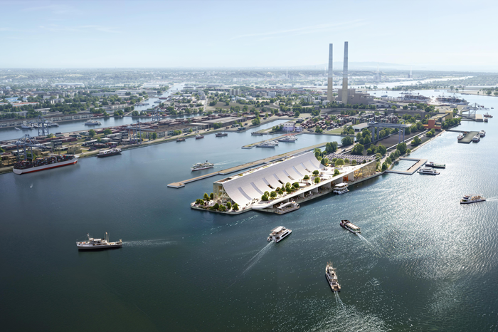 One of the project’s key architectural features is an extension to the old curved roof, which extends into a continuous canopy along the quay. This roof helps coordinate circulation, creates shaded outdoor spaces, and establishes a spatial transition between the urban pathways and port operations. There are a series of semi-open public spaces and a covered courtyard beneath this extended canopy, allowing access both from the city and water.