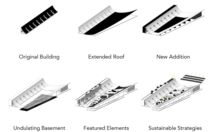 Environmental factors are incorporated by keeping the old structure and confining new building work. The large canopy provides passive shading and helps moderate microclimatic conditions along the waterfront. The courtyards and apertures in the roof bring natural light into the interior spaces, while ventilation strategies take advantage of coastal breezes.