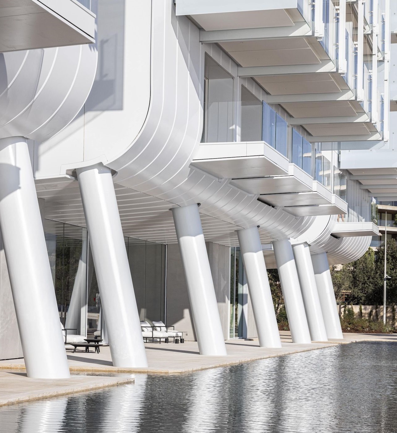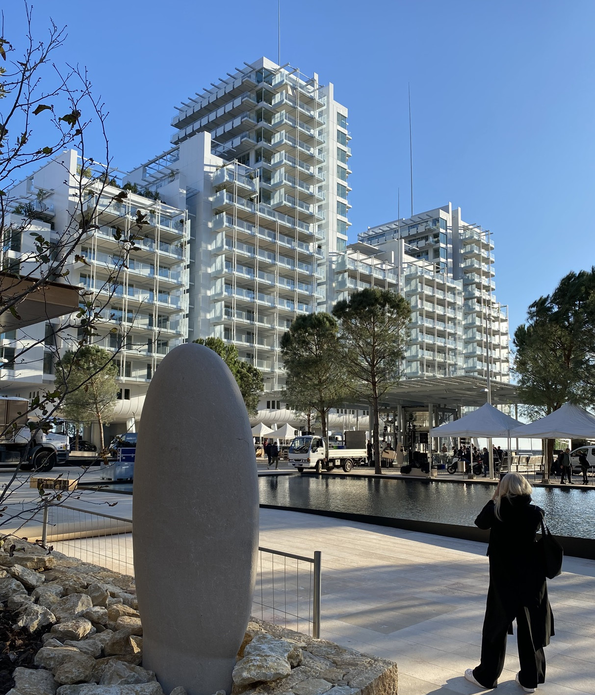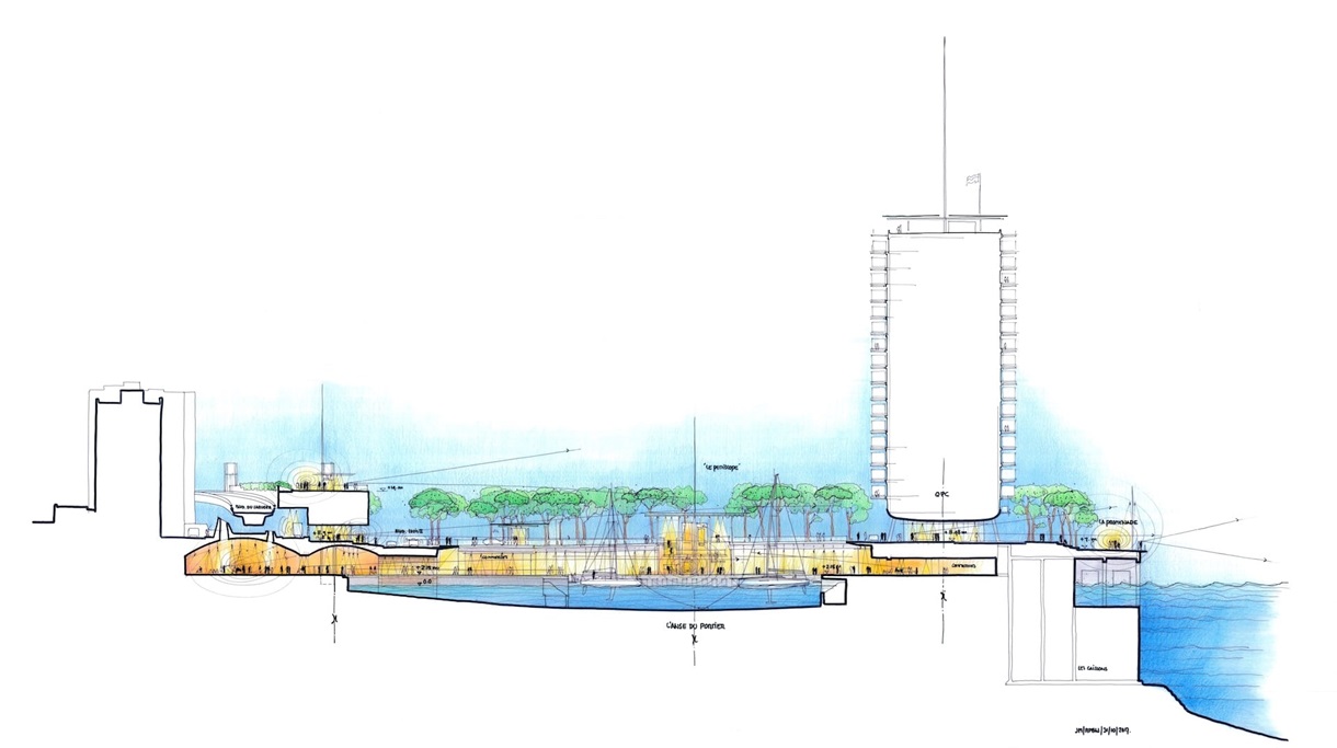 The most eye-catching and distinctive building designed by Renzo Piano RPBW called ‘Le Renzo’ stands like a sort of ship on the eastern tip of the peninsula. It features two building blocks (17 and 14 storeys tall and 70m and 50 m high respectively) supported by 4-metre pilotis that open up the ground floor to allow views out to sea.
