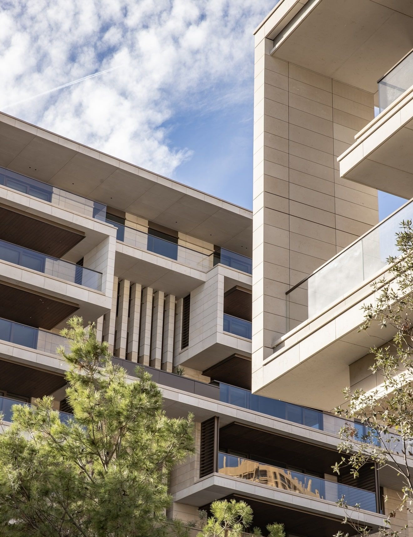 Denis Valode, who, in addition to the master plan, also designed four 7-11 storey buildings - Les Jardins de l'eau - four lower-level residences immersed in a park and some of the 10 villas overlooking the sea, drew on a linear design idiom inspired by the earth, using natural materials such as stone and wood with large terraces on every floor and an ingenious system of jacks fitted into the lower part of the terraces to block out the sun.
