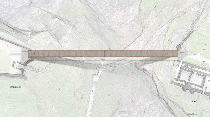 It is at this point that the bridge will reveal itself, without imposing its presence, it will draw visitors naturally to this point. The structure tapers from a height of 4.5 m where it springs from the rock face to just 170 mm at the centre, with an open joint between the mainland and island halves.