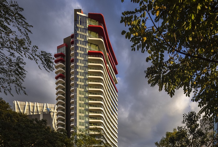 On the ground floor there is a brightly lot entrance hall with access to an indoor pool, fitness room, yoga room and hammam located in the basement, and garden. Three floors of underground parking complete the facilities of this elegant tower whose main features are dynamically designed terraces, transparent surfaces and, of course, the use of red - a colour Odile Decq is very fond of and Barcelona’s signature colour - to mark the top floors and the eye-catching structures of the Sky Terrace. It also appears inside combined with black for the surfaces of the communal areas.