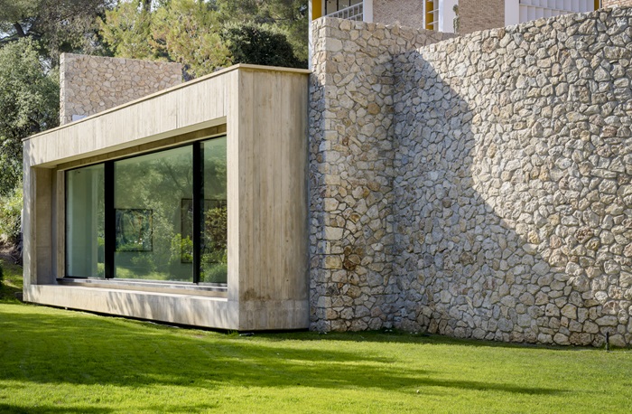 The two structures are only visible from the new external pathway connected to the Miro Labyrinth framed by two light-coloured concrete frames that match the stone of the basement and travertine of the flooring.