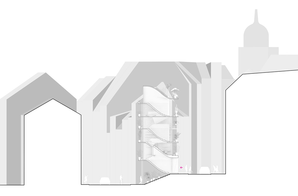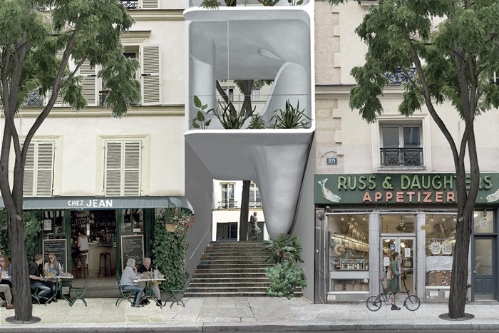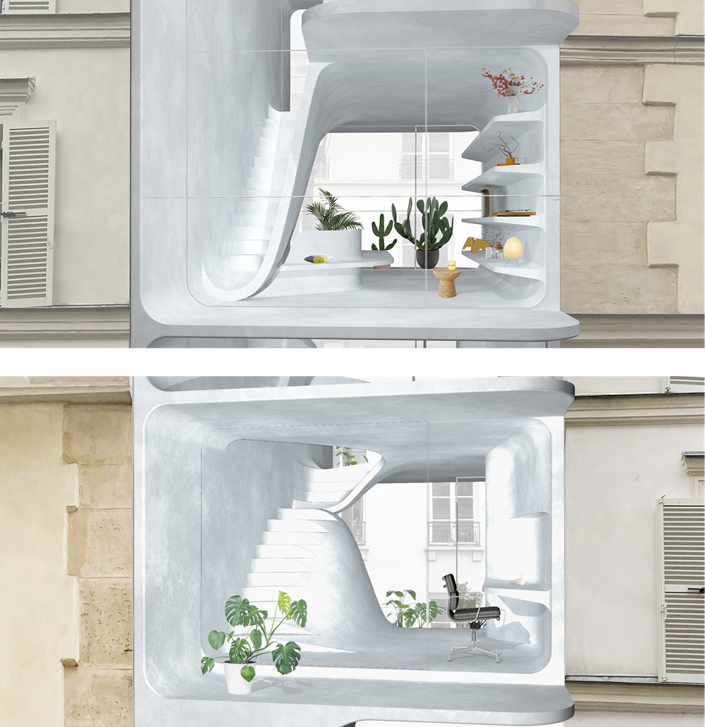 The Topological Habitacle shows a continuous domestic circulation merging with the slabs on each floor. Obtained by deformation of the floors upwards or downwards, it was designed with the narrow and short land features in mind, close to the body and neighboring walls, benefiting from generous living spaces. More generally, this topological case study can be adapted to similar short and narrow lands located in cities.