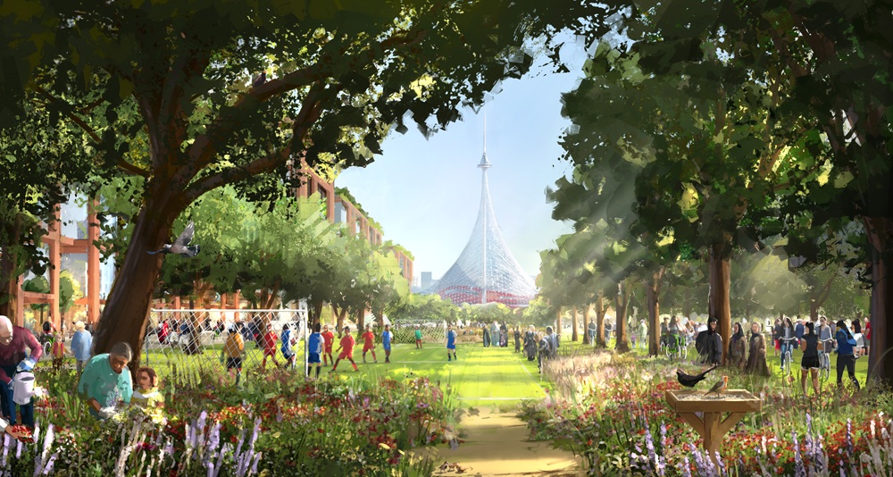 mixed-use district, with a network of green civic spaces, streets, bridges, and