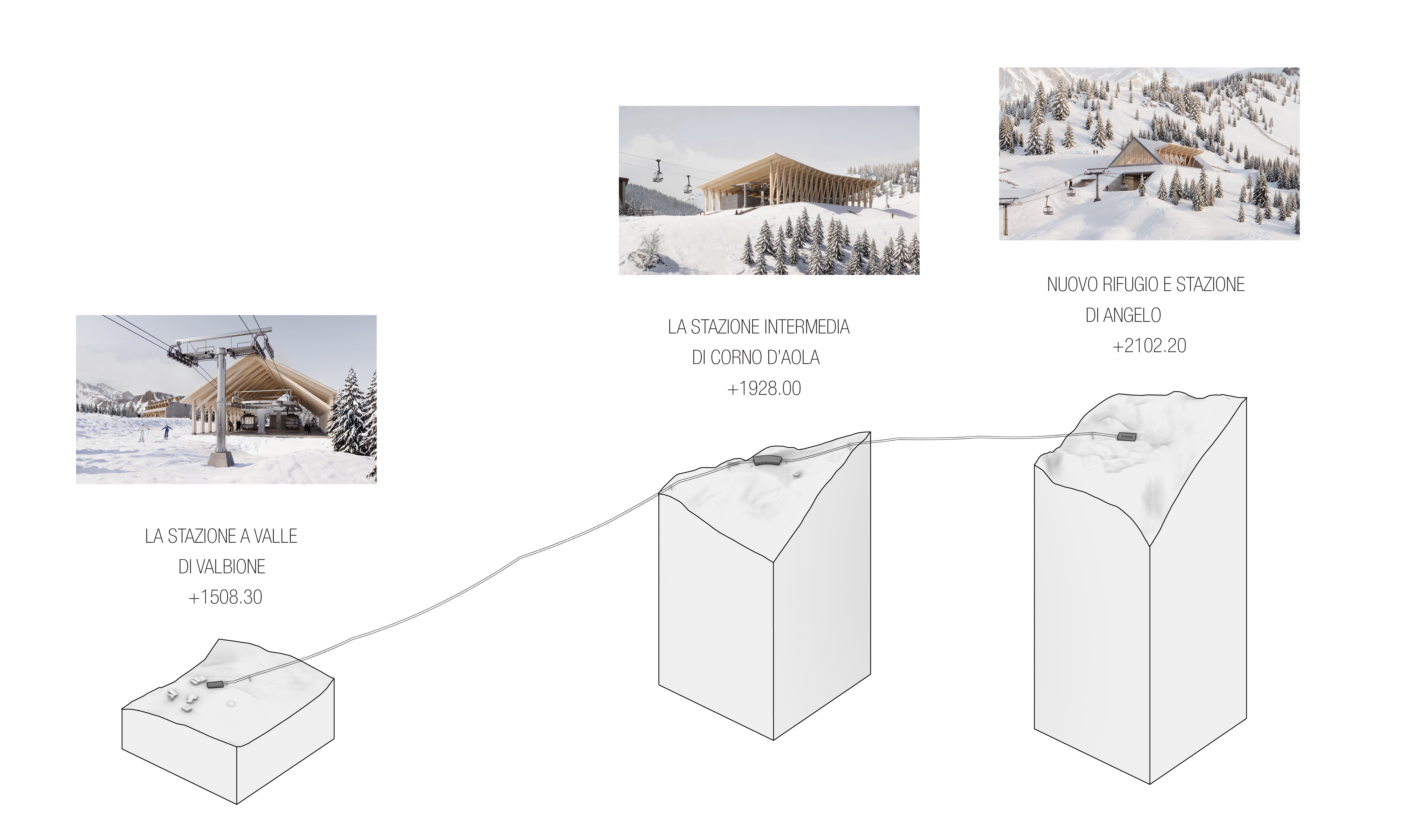 Le projet prévoit le remplacement de deux téléskis existants par une télécabine à câble unique, créant ainsi une liaison verticale directe et tangible entre le fond de la vallée et le sommet du mont Angelo. Les stations d'altitude sont conçues comme des structures légères en bois, unifiées par un langage architectural cohérent, ancré dans les traditions de construction locales.