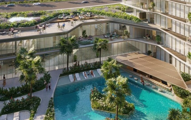 Les niveaux inférieurs abritent divers services, dont un spa, un studio de yoga, une aire de jeux pour enfants et des piscines lagon, le tout organisé autour d'une cour centrale paysagée. Une piste de course entoure le bâtiment, où la végétation luxuriante et une petite cascade constituent un repère naturel. Les étages supérieurs offrent différents types de logements, du studio aux appartements d’une, deux et trois pièces, y compris des duplex d'angle avec vue panoramique sur la mer.