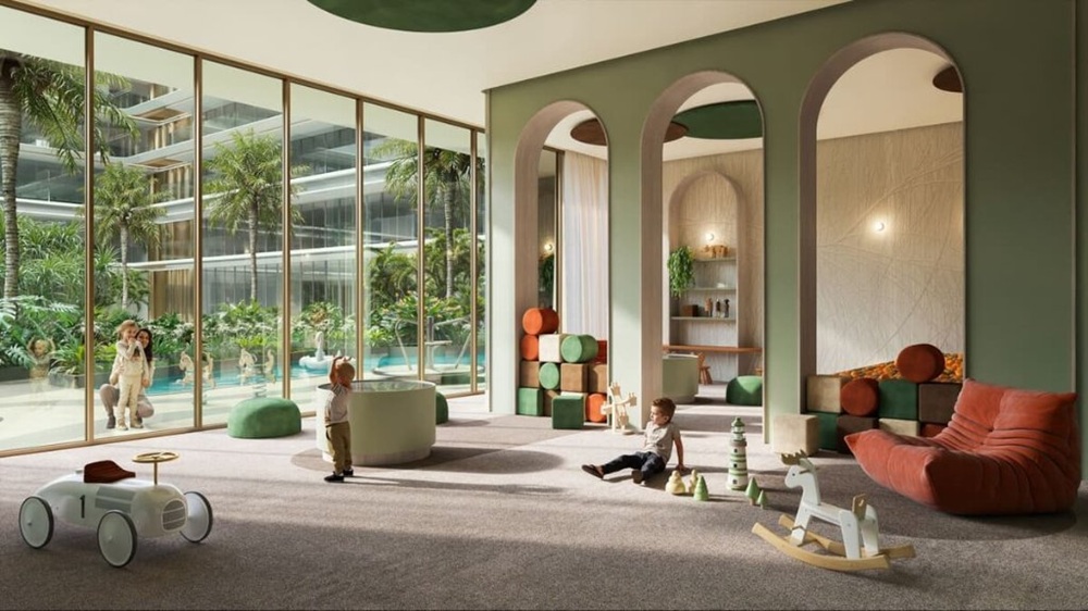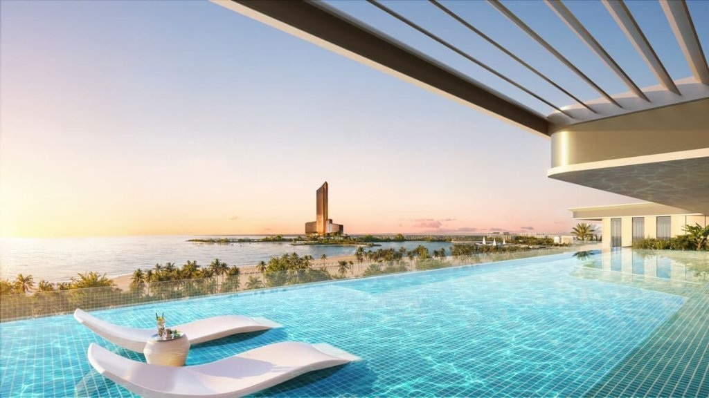 Au sommet de la tour, une piscine à débordement sur le toit, un bar panoramique et des jardins privés avec jacuzzis offrent une vue imprenable sur le Golfe Persique, créant un havre de paix suspendu entre ciel et mer.