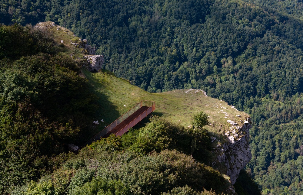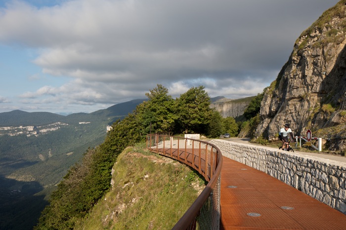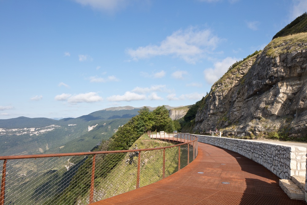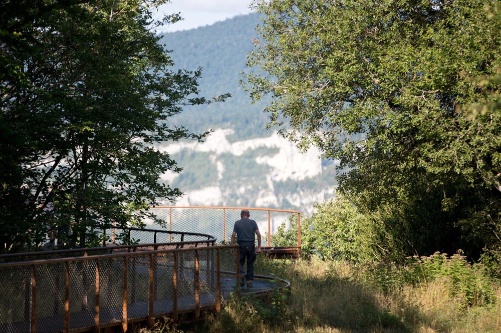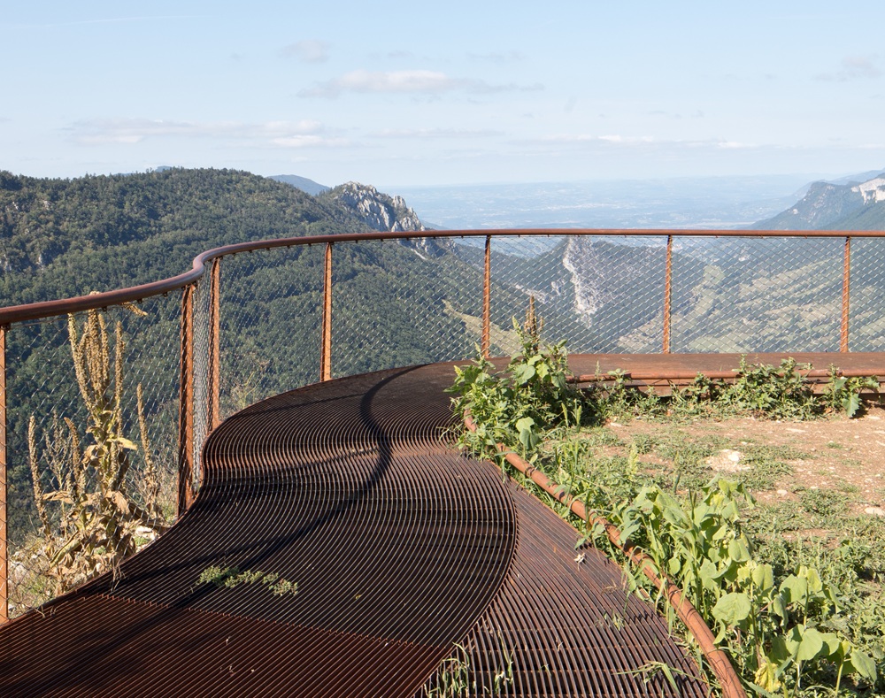 Le belvédère des Lames propose une expérience cinétique : un caillebotis métallique composé de lames accompagne la marche au bord du précipice et dialogue avec les lames calcaires de la combe de Bouvante.