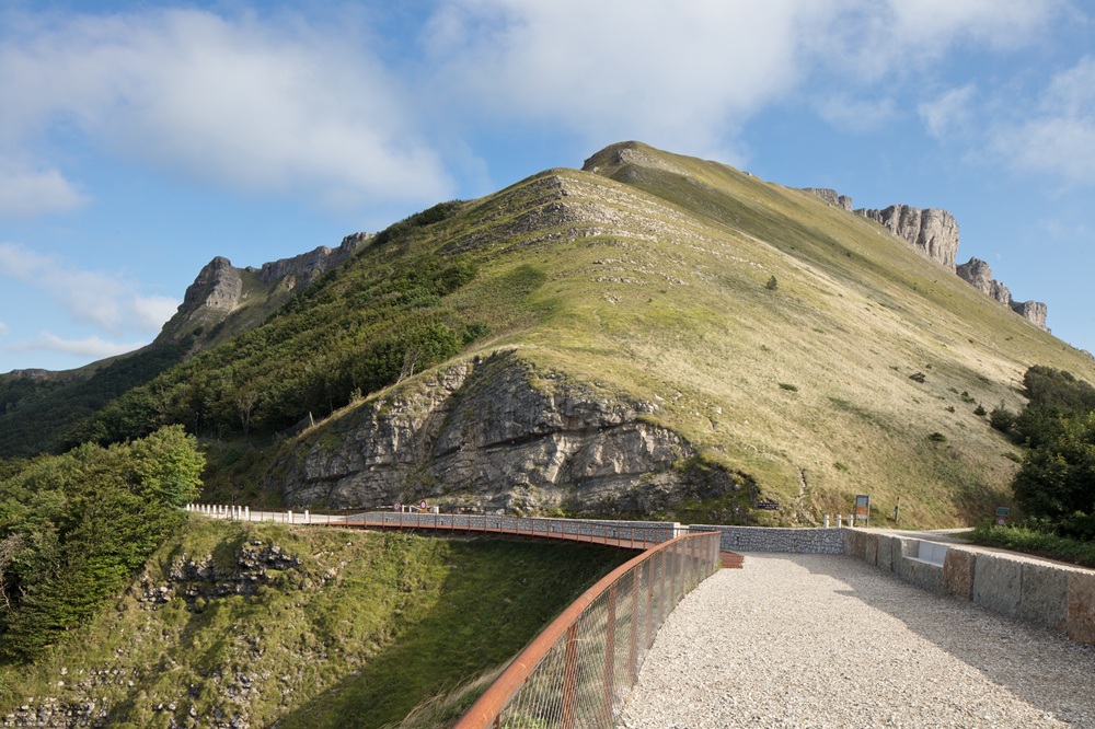 Enfin, au Pas de l’Aubasse, l’ancien parking a été reconfiguré en belvédère accessible à tous. Le projet redessine les limites du site et révèle la nature du lieu : un seuil paysager largement ouvert sur le grand paysage de la vallée.