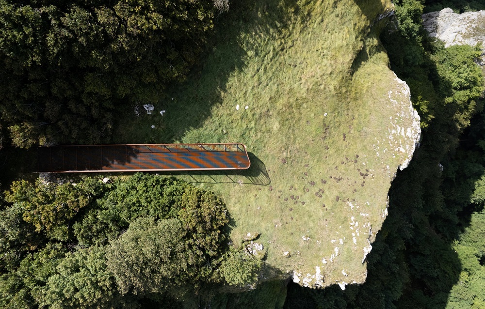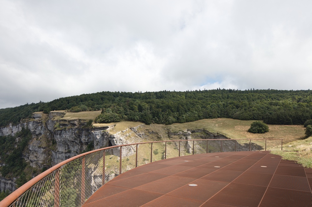 Les aménagements s’inscrivent au plus près de la géographie du lieu. Lignes et surfaces prolongent les dynamiques de la montagne et maintiennent un dialogue constant avec la route. Une palette matérielle restreinte – pierre calcaire issue du site et acier autopatinable – confère une unité discrète à l’ensemble. Par leur précision et leur retenue, ces interventions n’imposent pas une architecture spectaculaire. Elles orchestrent plutôt une mise en mouvement du regard, transformant l’arrêt routier en expérience de paysage.