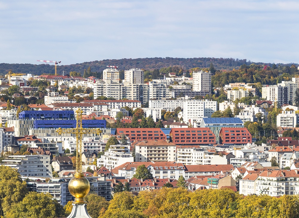 terre cuite, qui dialoguent avec les toitures bleues du Siège administratif