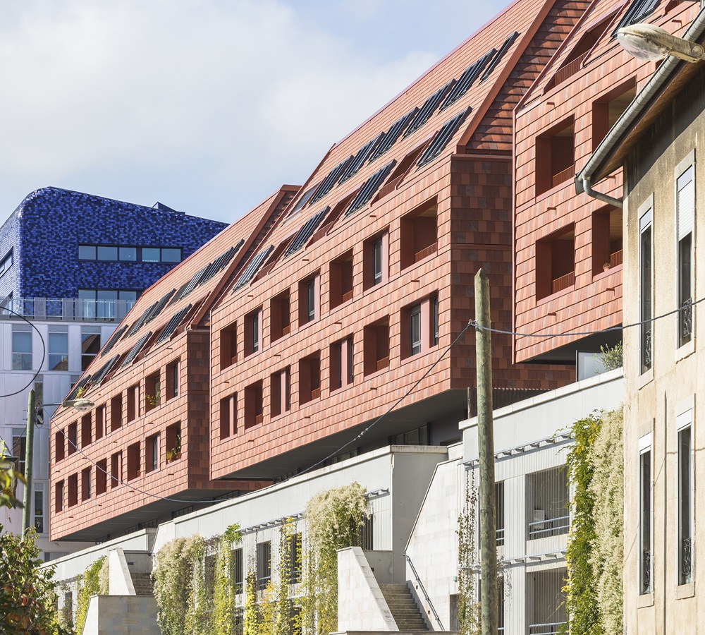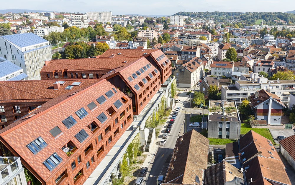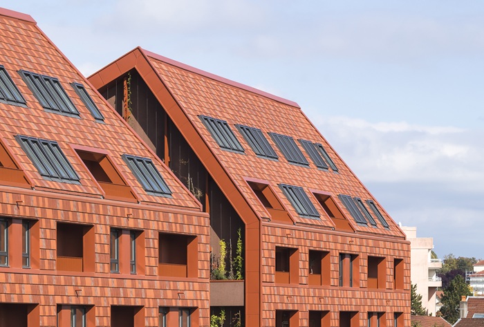 toitures aux pentes variées se fondent dans les façades verticales grâce au jeu
