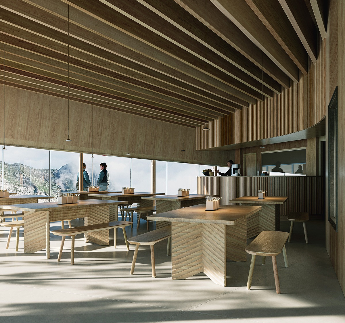 La pierre locale est prévue pour le socle, assurant une parfaite intégration dans le contexte montagneux et préservant l'authenticité du paysage. La volumétrie du bâtiment s'inspire de la topographie du territoire environnant. La toiture végétalisée forme une extension de la flore et de la faune, tout en créant une transition harmonieuse entre l'architecture et le paysage de montagne.