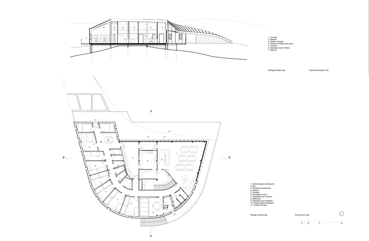 Basé sur une conception bioclimatique, le refuge se caractérise par une structure compacte qui minimise la quantité de façade exposée aux éléments climatiques et s'intègre parfaitement dans le paysage grâce à un grand toit végétalisé et une enveloppe protectrice en aluminium recyclé, qui abrite les espaces extérieurs des vents dominants. La double orientation du bâtiment favorise également la ventilation naturelle. L'aménagement du refuge s'organise en deux espaces principaux : les espaces de vie, ouverts sur le paysage et le lac de Barroude, et les chambres, positionnées au nord. Cette disposition permet de gérer le degré d'intimité des différents espaces, avec une progression depuis les zones les plus ouvertes, les espaces communs comme la salle à manger et la cuisine, jusqu'aux plus protégées, les dortoirs des randonneurs et des gardiens.