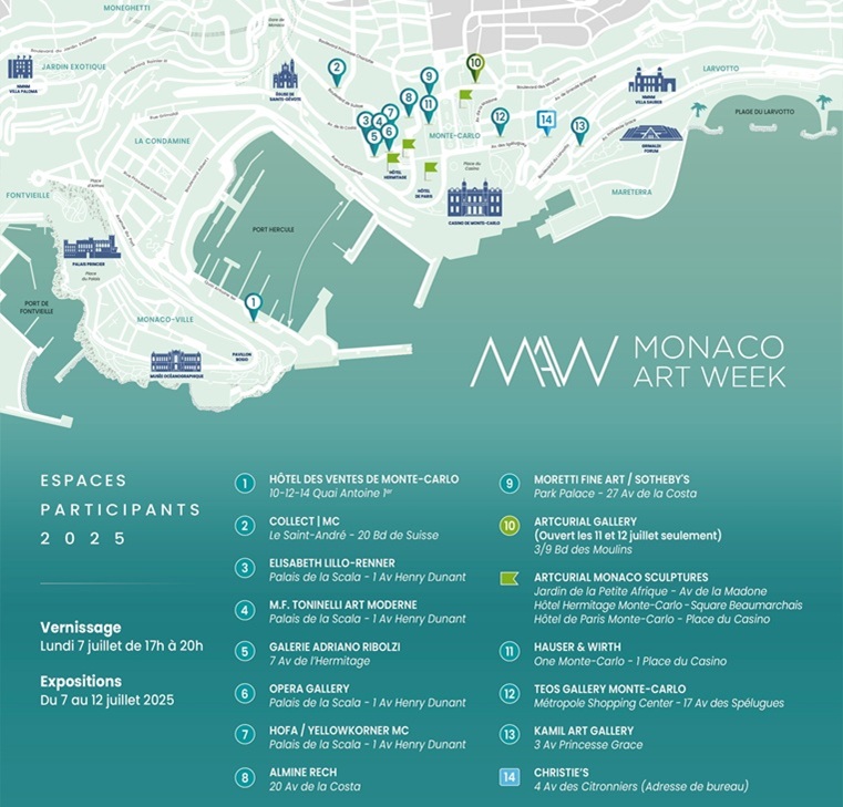 La Monaco Art Week 2025 riunisce 15 partecipanti distribuiti in diversi quartieri del Principato: Artcurial; Christie's; collect|mc; Hauser & Wirth; HOFA; Hôtel des Ventes de Monte-Carlo; Kamil Art Gallery; Elisabeth Lillo-Renner; Moretti Fine Art; Opera Gallery; Almine Rech; Galerie Adriano Ribolzi; Sotheby's; Teos Gallery Monte-Carlo; M.F. Toninelli Art Moderne. L'evento beneficia del prezioso supporto dei suoi sponsor principali, EFG Bank (Monaco) e Moravia Yachting, nonché di SMT Société Monégasque de Transports.