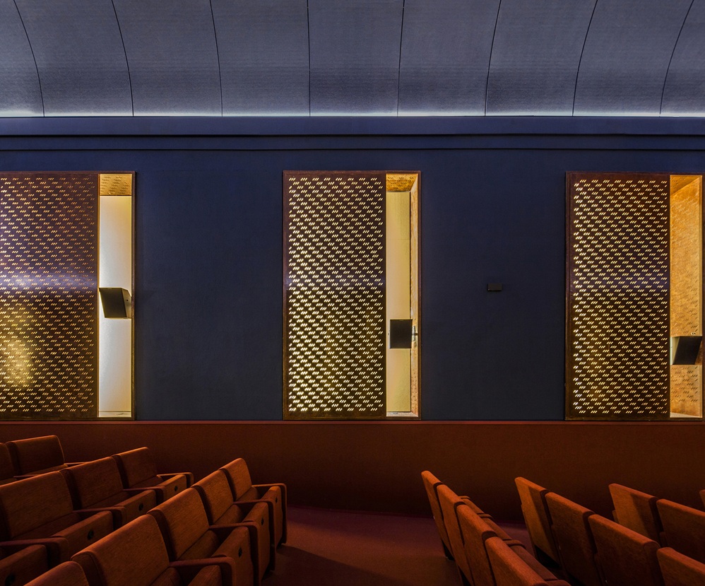 This was achieved by altering the entrance and main hall and upgrading the room materials to improve the acoustics and visuals of the new systems. Jaume Bach and Gabriel Mora designed an auditorium in 1987. Two new spaces converted the existing facility into a cinema and auditorium while retaining certain old iconic features: the projection room and suspended triangle above the stage, which is actually a reverberation device. The translation booths, now unnecessary due to new technology, have been removed. The seating area was also modified to make it steeper and improve screen visibility. The hanging triangle has been converted into a large acoustic screen that conceals the speakers. The new hall is still reminiscent of 'geometric objects' under a vaulted space, which originally featured a starry sky, as suggested by Leon Battista Alberti. The old windows have been altered by being enclosed by wooden panels carved with patterns that look like raindrops as if the panels were outdoors. They have been painted the same blue colour as the starry vault. The classic red colour is like Skandia Cinema in Stockholm designed by Erik Gunnar Asplund and the Doré in Madrid.