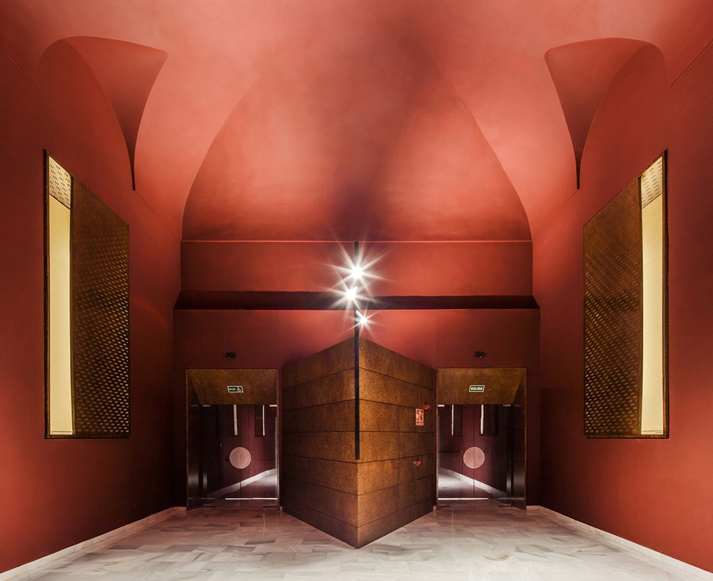 The red and blue colour of the carpet is similar to the colour scheme of classical theatres to emphasise the space’s function and the tradition of neoclassical buildings housing film theatres. To mediate between the two colours, the sound-absorbent surfaces placed in the niches act as soft spotlights amplifying the feeling of being outdoors. A triangular storage unit in the entrance hall interacts with the geometric design of the projection booth and leads towards the exit. The Venetian window has been conserved and its various surfaces, all in one shade of red, welcome visitors and reveal the new hall behind it. Mario Pisani