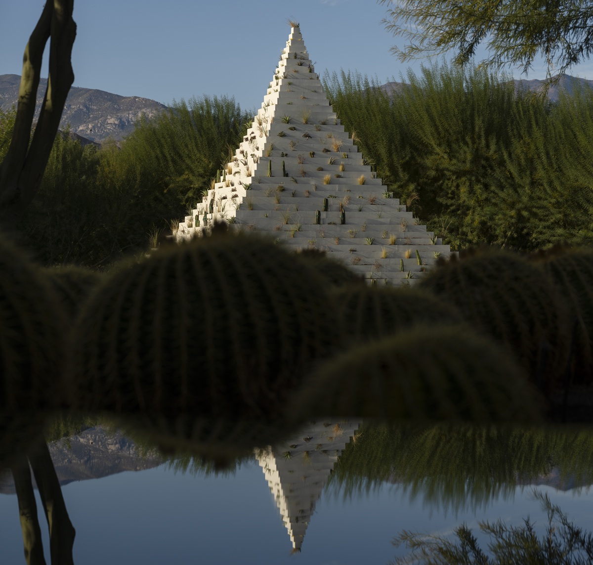 Top, view of Coachella Valley, California, photo by Lance Gerber, courtesy Desert X; below, installation view of Agnes Denes,The Living Pyramidat Sunnylands Center & Gardens, photo by Lance Gerber, courtesy Desert X