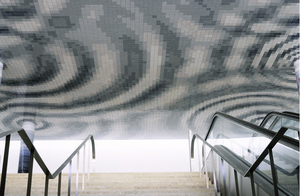 Sea Level is a well-known project along the Terreiro do Paço riverfront in Lisbon (2011), whose mosaic ceiling in shades of blue made out of 10×10 cm ceramic tiles creates metaphorical optical interaction with Tagus River.