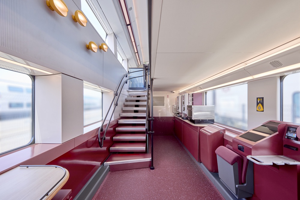 Gli interni e i dettagli sono stati riprogettati seguendo un tema centrale: creare un'atmosfera di comfort più morbida e personale in uno spazio condiviso. Questi sviluppi riflettono anche le qualità ecologiche del treno e il nostro impegno verso una progettazione post-carbonio. Il 97% dei materiali utilizzati è riciclabile. All'esterno, le tonalità chiare aumentano l'albedo e contribuiscono a ridurre il consumo energetico in estate. Credit photo: Yann Audic