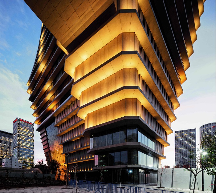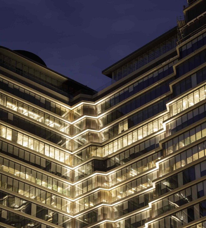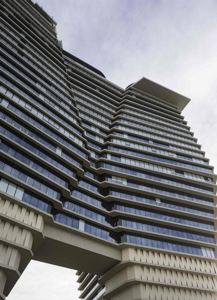 Si accede all’edificio di 53.000 m2 da un’esclusiva facciata inclinata a reticolo di cavi alta 30 m, che conduce a un atrio di sette piani arricchito con alberi da interno.