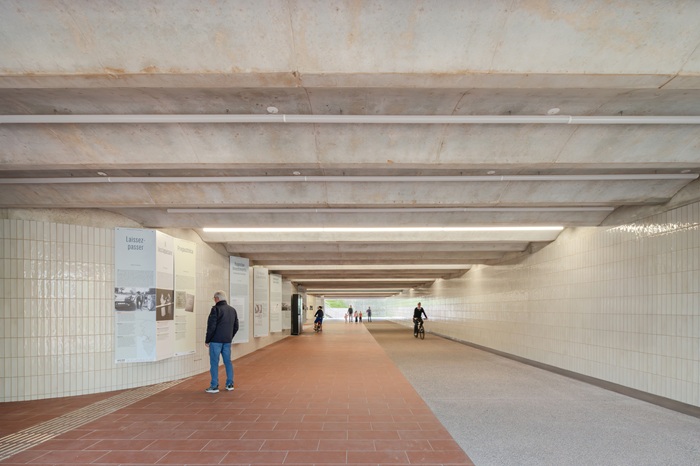 Il sottopassaggio che si estende per 36,6 metri di lunghezza e 8 metri di larghezza (in parte ciclabili e in parte pedonali), si apre alla due estremità su piazzette ellittiche ribassate che assorbono i flussi quotidiani invitando al contempo a un utilizzo informale: sedersi, incontrarsi, fare una pausa.