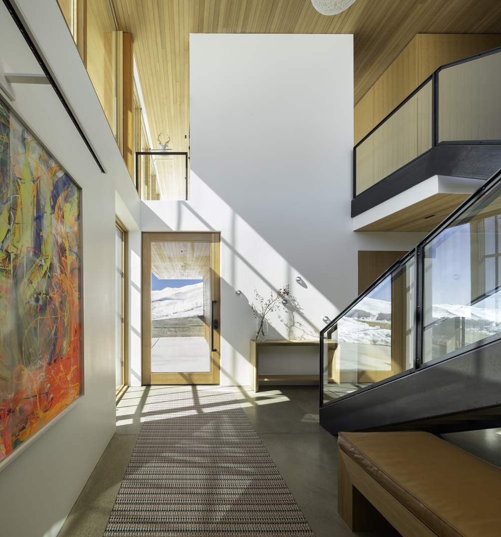 La disposizione su più livelli comprende una suite padronale con terrazza privata e bagno turco al livello superiore, rialzato di 1,5 metri rispetto al livello principale e che può essere completamente separato dal resto della casa. Il livello inferiore ospita due camere da letto e una camera separata con letti a castello a scomparsa, lo spazio spa/onsen e il ripostiglio/deposito sci con preti in acciaio brunito. Una sala multimediale con proiettore a bassa ottica al livello principale non ha finestre ed è acusticamente isolata dal resto della casa.