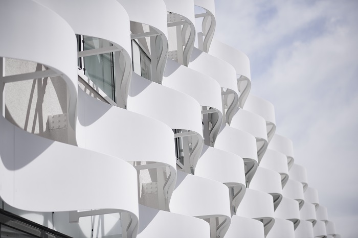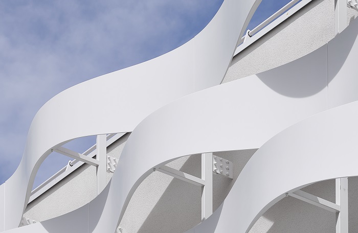 Per ottenere questo effetto ondulato è stata sviluppata una struttura di supporto in finitura bianca che ha permesso di posizionare ogni pezzo con precisione. Inoltre, la pulizia fisica e tecnica che Krion® offre, come l'isolamento, la resistenza ai rigori climatici, le sue giunzioni quasi impercettibili e il suo valore duraturo, conferiscono agli edifici un tocco artistico e originale.