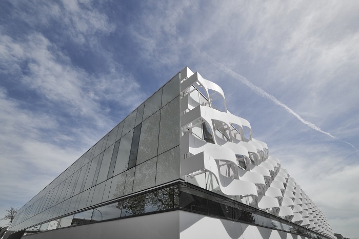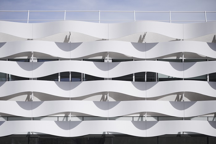 Il rigore formale dell'edificio, che risponde agli imperativi organizzativi e tecnici dell'istituto, è dinamizzato da una facciata leggera e ondulata realizzata in minerale compatto Krion® K-Life 1100. Grazie alle prestazioni di questa Solid Surface di nuova generazione, sviluppata da Krion Porcelanosa Group, gli architetti hanno progettato una facciata caratterizzata da ampi nastri a forma di onda che creano una sensazione di movimento e luminosità, in contrasto con le tonalità uniformi dell'ambiente circostante.