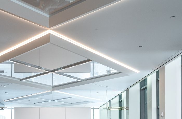 La maggior parte dei soffitti acustici sono stati installati direttamente utilizzando profili di fissaggio. Tuttavia, per un'area dietro il soffitto a forma di diamante, che a volte richiedeva l'accesso ad attrezzature meccaniche, CLIPSO ha optato per profili in alluminio di spessore 42 mm, al fine di realizzare un telaio acustico autoportante, e ha utilizzato il sistema di montaggio “torsion springs”.