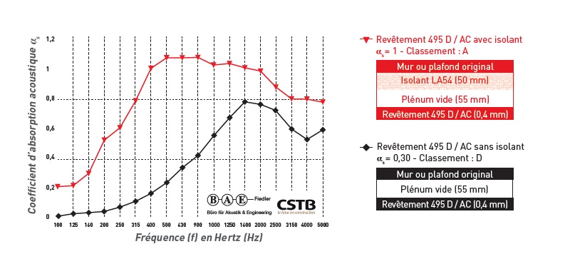 Per l’ambiente a doppia altezza, CLIPSO ha raccomandato l'uso del rivestimento 495 D in combinazione con l'isolamento acustico LA 54 al fine di ottenere un coefficiente di assorbimento acustico fino a 1,05.