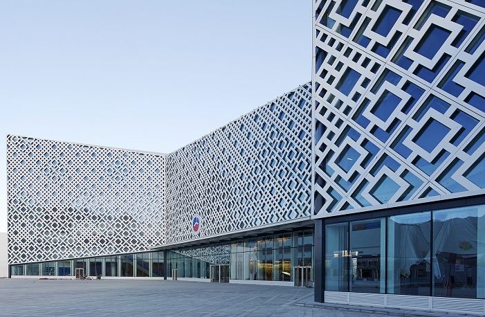 Una grande hall d’ingresso gioca da spazio tampone e garantisce le prestazioni energetiche dell’edificio. In copertura e in facciata, i diversi spessori dei motivi della maglia strutturale permetto di filtrare i sole e modulare la luce e la temperatura interne.