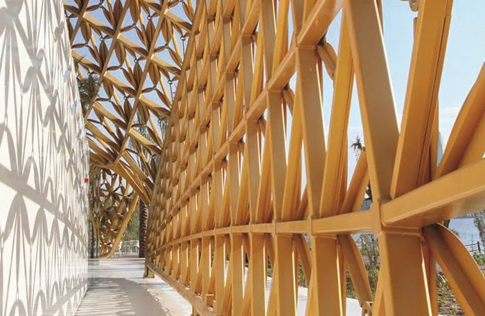 La forma e il design di questa copertura biomorfa sono il prodotto di un'intensa ricerca formale per conciliare il design parametrico con il tradizionale ornamento arabo.