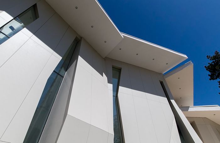 La scelta del gres porcellanato laminato di grande formato Kerlite3plus di Cotto d’Este, ha permesso ai progettisti di esaltare il gioco di superfici in un alternarsi articolato tra elementi pieni e vetrati.