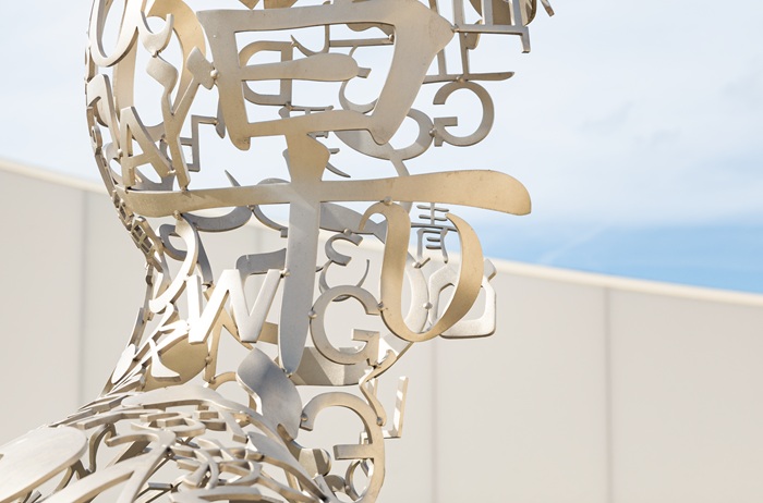 Luminoso e aperto, l'interno del Padiglione consente una circolazione fluida, dando vita a diverse esperienze: lounge, champagne bar e boutique, terrazza, ecc. Isolamento in materiali di origine biologica, tetto verde per rinfrescare l'edificio, vetrate serigrafate per ridurre i raggi solari, l'energia geotermica per la regolazione della temperatura, la raccolta dell'acqua piovana, tutto è stato concepito per rispondere alle preoccupazioni ambientali della Maison Ruinart. (foto: Jaume Plensa, Dom Thierry Ruinart, Acciaio inossidabile lucidato, 2016)