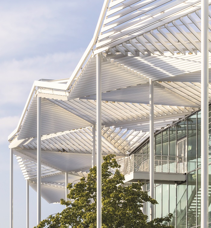 La grande facciata trasparente e gli origami in acciaio e alluminio (lunghezza 101 m + piegature) si aprono a ovest sul parco, un vasto spazio pubblico ricoperto da prati e in parte alberato. Grazie all’apertura e chiusura automatica delle aperture sulla facciata (utilizzate anche per l’estrazione naturale dei fumi dall’atrio), la ventilazione è naturale e permette di ventilare e rinfrescare l’ampio volume dell’atrio.