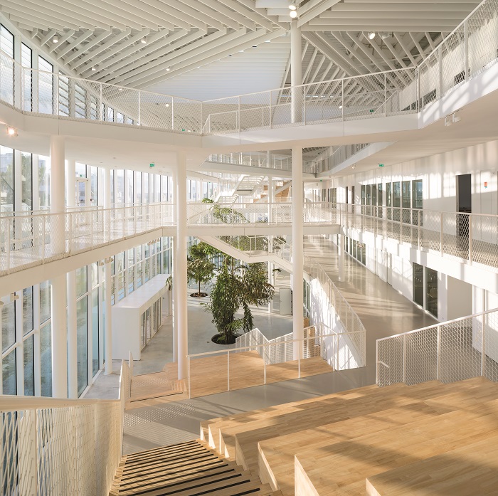 Molto generoso, questo volume fluido lascia spazio agli incontri e agli scambi tra studenti, ricercatori, docenti e ospiti. Le reti di passerelle, scale interne e grandi stand in legno offrono numerosi spazi informali, supporto per incontri e scambi che aumentano le occasioni di interazione e abbattono le barriere.