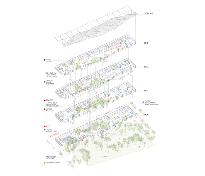 Clients: École Polytechnique, Institut Mines-Télécom (Télécom Paris & Télécom SudParis), ENSTA Paris, ENSAE Paris, AgroParisTech, Institut d’Optique Graduate School (IOGS); MOD: Epaurif; Project: Sou Fujimoto Architects (representative, www.sou-fujimoto.fr) | Nicolas Laisné architectes (www.nicolaslaisne.com), Manal Rachdi/OXO architectes (www.oxoarch.com),Dimitri Roussel/DREAM (dream.archi) ; Team: Sou Fujimoto, Marie de France, Adrien de Lassence ; Worksite: Volker Grage, Esther Lotz, François Vaugoyeau; Studies: Louis Bauchet, Mirrela Verdes Montenegro, Przemek Witkowski ; Competition: Jane Luk, Nicolas Gustin, Marcello Galiotto, Nadine de Ripainsel, Manal Rachdi, Traian Bompa, Helena Frigola, Irene Bargués, Nicolas Laisné, Dimitri Roussel, Margaux Desombre ; Consultants: EGIS Bâtiment Alain Collet, Guillaume Delorme, Laurent Rami, Mario Figueiredo, Jean-Jacques Tsobnang, Alexandre Kirsz, Houssein Karaki, Ricardo Lopez, Nawfal Alami; Franck Boutté Consultants (environment), Jean-Paul Lamoureux Acoustique, Thomas Jourdan, MOZ Paysage - Ewen Le Rouic, Céline YamatoLes Eclaireurs (lighting concept) Lucas Goy/Studio Briand & Berthereau (graphics). Contractors: ML01 covered clots : NGE (main works) & Fayat Metal dont ACML (Façade), Bardot (structure métal), Castel Alu (aluminium), ML02 Exterior : Conserto (VRD) & Artopia (green spaces), ML03 architectural lots : Roux-Freres (carpentry) Loison (metal works), Vallee (floors, ceilings) JOBIN (plaster); ML06 lifts: TKE elevator (Thyssen); Photo: Sergio Grazia, Iwan Baan