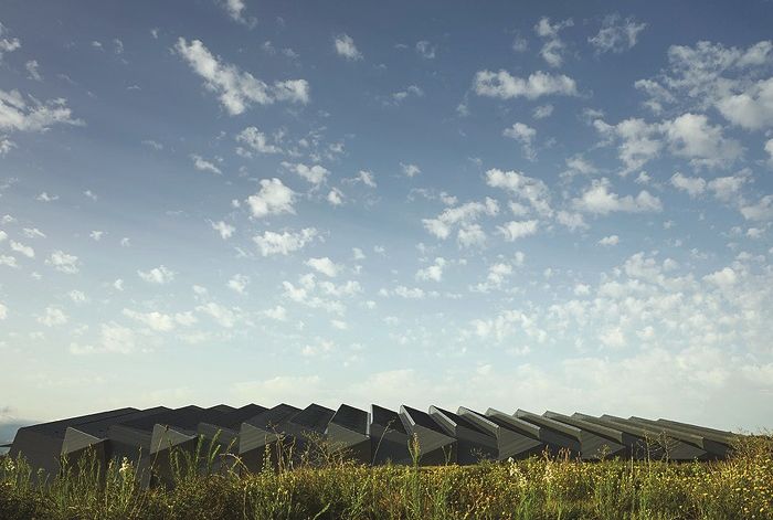 In facciata il sistema si traduce in elementi spezzati che ricordano lontanamente delle rocce fratturate che emergono dal terreno pianeggiante. Forte risulta la dicotomia tra l’elemento geometrico della cantina e la forma fluida delle dune inerbite che delimitano l’area di pertinenza dei mezzi e degli accessi funzionali alla cantina.
