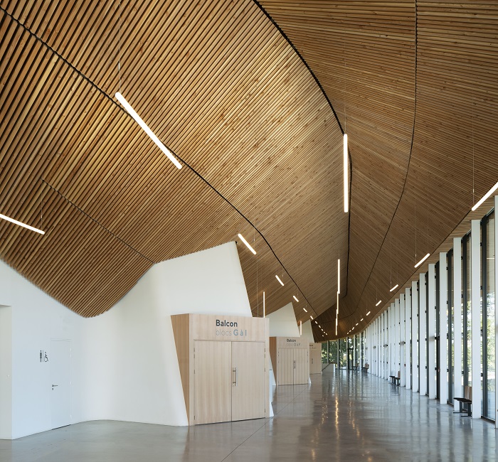 L'altro materiale utilizzato negli ambienti interni è il legno, declinato in diversi modi. I soffitti della hall d’ingresso, realizzati con tasselli di legno traforati per l'acustica, sono stati completamente modellati in 3D e prefabbricati. Nelle sale le sedute sono in legno e il legno riveste anche parti della parete da arrampicata, le porte di accesso alle sale, i soffitti delle aree comuni al livello inferiore, ecc.
