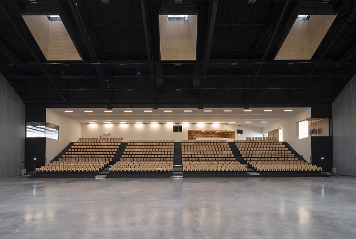 Client: Conseil départemental de la Mayenne; Project: Hérault Arnod Architectures; Project team: Mickael Dusson et Jérôme Moenne-Loccoz (project manager), Paola Figueroa, Thomas Féraud, Rana Abi Ghanem; Construction team: Florent Bellet (project manager), Arnaud Gillet, Inex (fluids), Batiserf (structure), BMF Conseil (economy), Ducks Scéno (scenography), Lasa (acoustic), Sempervirens (landscape), Gérard Plénacoste (graphics), Hervé Audibert (outdoor lighting), B3I, VRD; Photos: André Morin, Cyrille Weiner