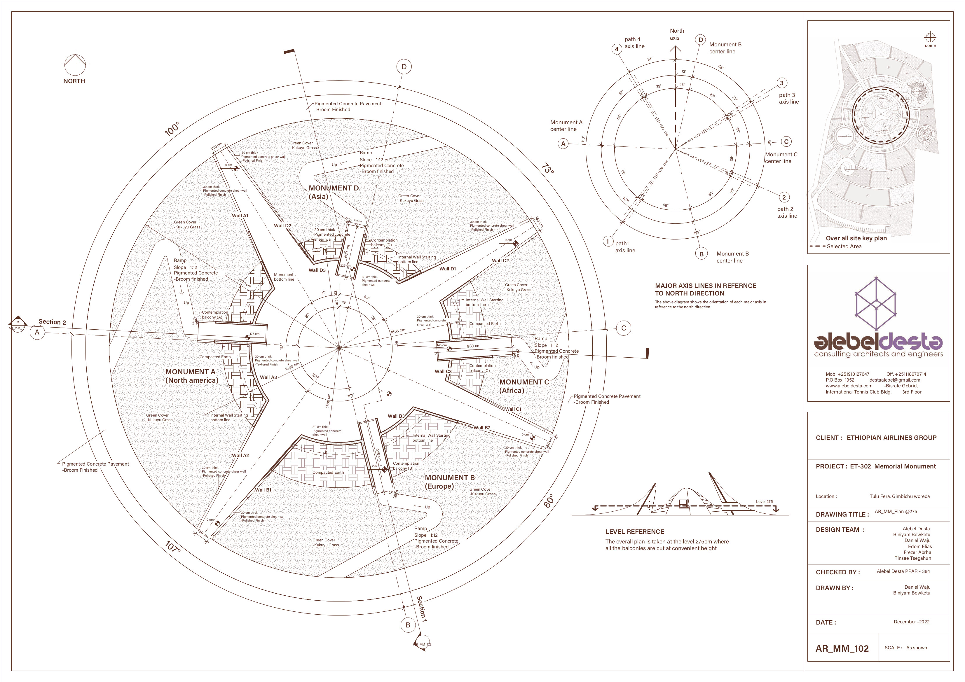 Client: The Boeing Company and Ethiopian Airlines Group; Voluntary Committee Representing the Families of ET-302 Victims; Emergency Response: Blake Emergency Services; Design and Supervision Consultant: Alebel Desta Consulting Architects and Engineers; Architectural Design Team: Abraham Lelisa, Alebel Desta, Biniyam Bewketu, Daniel Waju, Edom Elias, Frezer Abrha, Shiferaw Tatek, Solomon Desta, Tibebu Arega, Tinsae Tsegahun; Contractor: Elmi Olindo Contractors Plc; Structural Design: Kenmos Engineering; Sanitary and Mechanical Engineering: Werede Melaku and Team; Electrical Consultant: Splenor Technology PLC; Detailed Road Design and Supervision: ENISRAD; Landscape Works: Green Paradise Gardens; Material Sourcing and Shipping (Italy): ACOMEX; Project Coordination: ZIAS Engineering Team; Project Management: Turner & Townsend; Logistics, Events, and Coordination: Prologue Marketing PLC ; Photography: Aron Simeneh