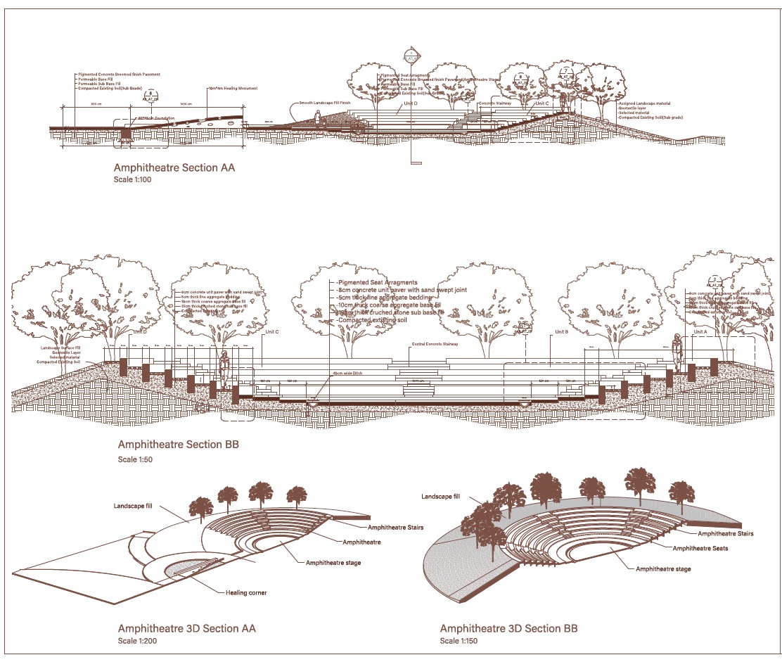 luce, esprimono resilienza e speranza; un anfiteatro con sei gradinate