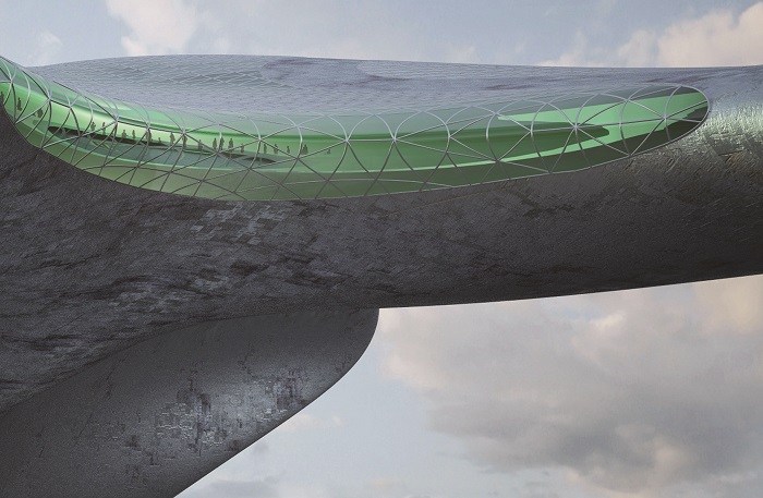 Unità abitative, spazi culturali e di intrattenimento, scuole, laboratori scientifici e medici, aree pilota, ponti, strumenti tecnici e di navigazione, impianti meccanici per il ricambio/trattamento dell’aria, officine e laboratori di produzione, aree verdi, aree ludiche e sportive, ecc. sono situati nella sezione di galleggiamento variabile e nella sezione emergente.