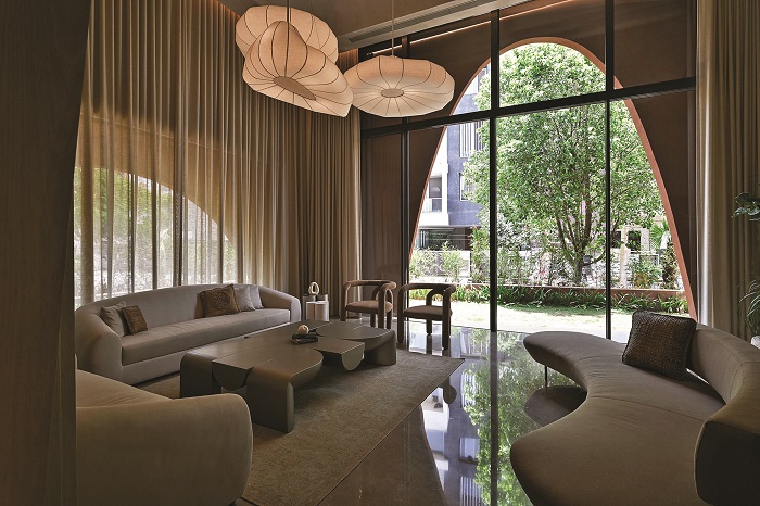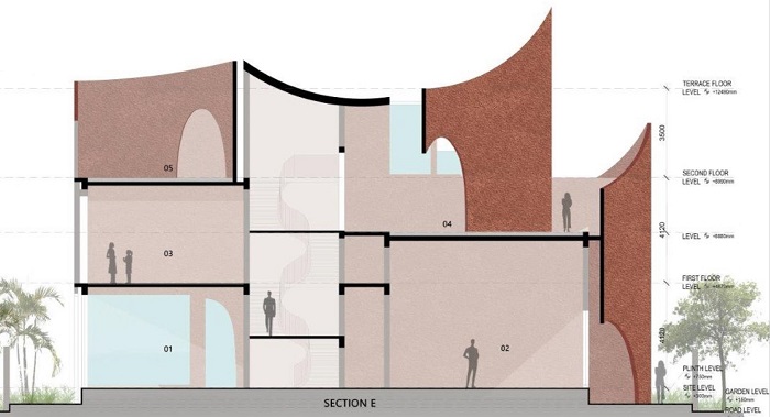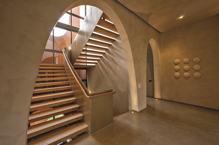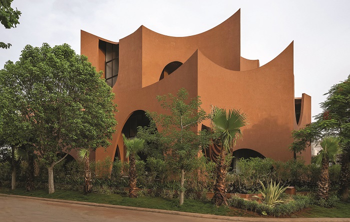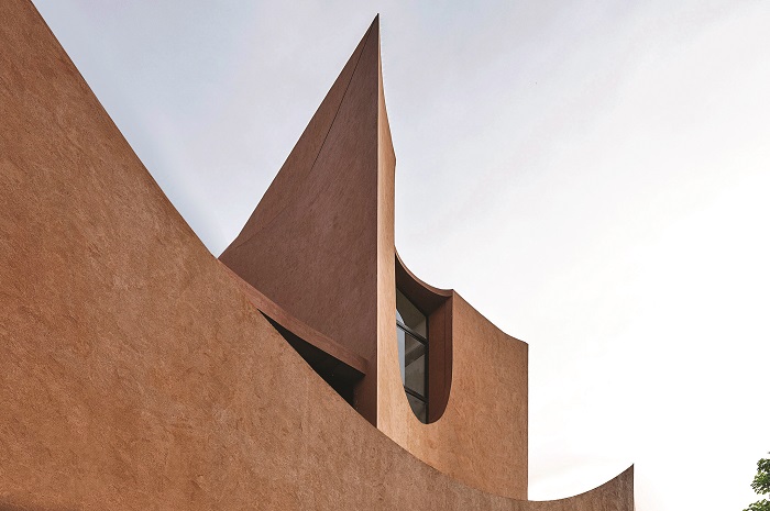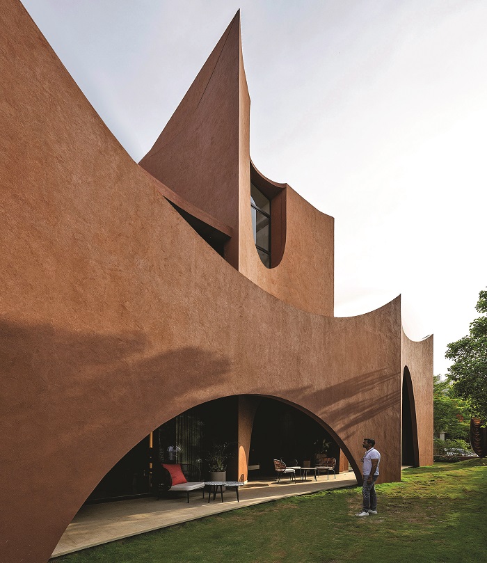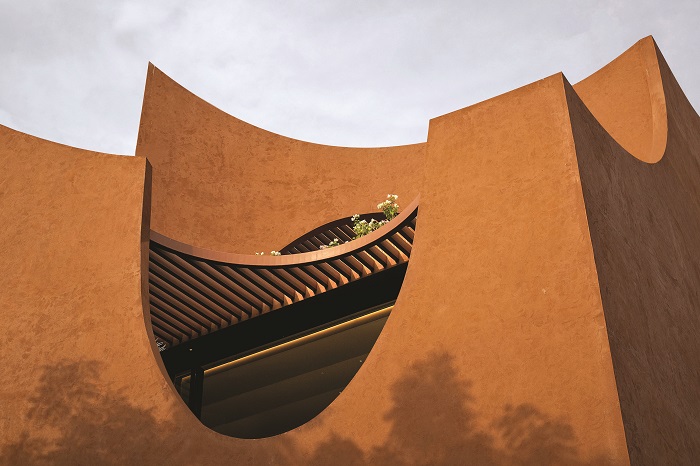 Questa casa scultorea è contestuale all’ambiente circostante, al clima e alle esigenze del proprietario, risultando in un interessante gioco di volumi, spazi aperti, chiusi e semichiusi a ogni livello. Il progetto crea spazi ad alta efficienza energetica con ridotto guadagno di calore e luce naturale indiretta in ogni parte della casa.