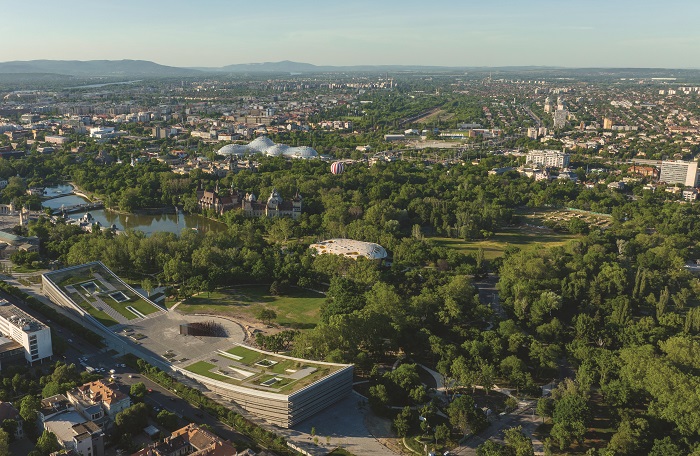 Le linee leggermente curve consentono all’edificio di fungere da porta e passaggio di collegamento tra la città e il parco. Il 60% della struttura è interrato e, grazie al tetto paesaggistico e alla trasparenza delle sezioni fuori terra, il nuovo museo si adatta anche alla sua scala ambientale. L’area del tetto erbosa è un piacevole spazio comunitario che attende i visitatori di Városliget.